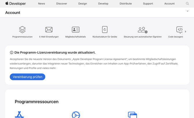 - Im oberen Bereich der Seite erkennst du sofort einen Balken mit einem Hinweis zu den neuen Programm-Lizenzvereinbarungen. Klicke auf den blauen Button "Vereinbarung prüfen" und stimme danach den Vereinbarungen zu.
