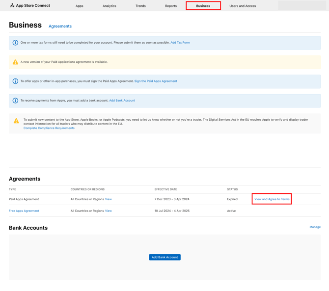 Achtung: Wenn das Zustimmen der offenen Verträge unter "Geschäftliches" in Apple Store Connect nicht funktioniert, versuche Folgendes: